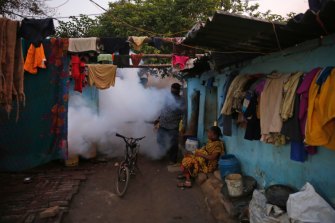 An Indian health worker fumigates to prevent the spread of mosquito-borne diseases in Allahabad, India.Credit:AP